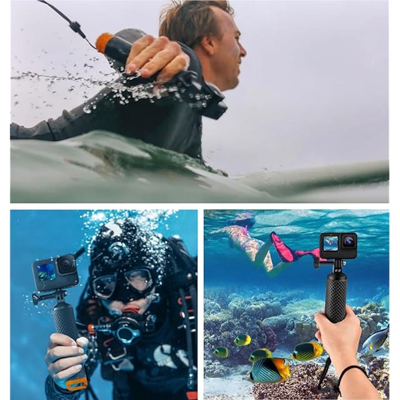 【フローティング撮影グリップ】 GoPro対応マウントのウェアラブルカメラ向け浮くグリップです。中が空になっていて、カメラとアクセサリーが水面に浮上し、水に沈むのを防ぎます。水に落としても浮くのは安心です。アクションカムでのマリンスポーツ動画撮影、セルフィー撮影、1/4”仕様のコンデジ・小型ビデオカメラ、スマホなどにも対応します。