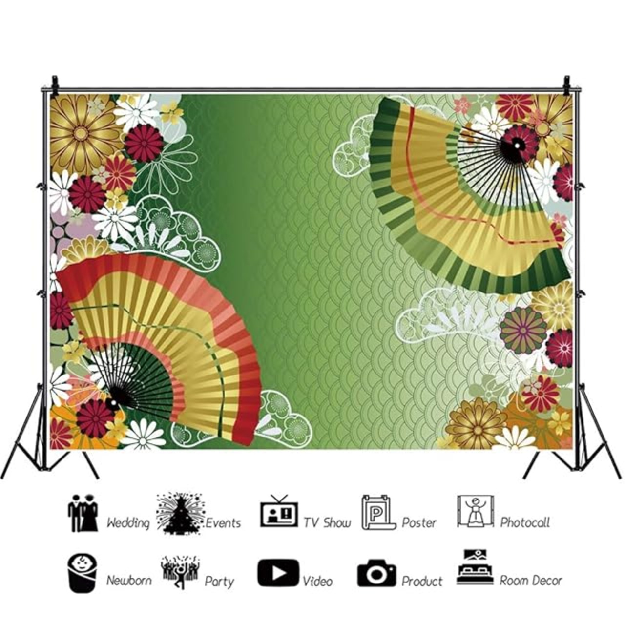 Qinunipoto 背景布 和風 七五三 写真の背景 1.5x1m 家の装飾 オフィスの装飾 事業活動 背景布 和風 撮影布 さくら 緑の背景 扇子 デイジー リップル 写真の背景 写真撮影用 商品撮影 人物撮影 写真スタジオ 撮影用 写真館 無反射布 カスタマイズ可能な背景 小道具