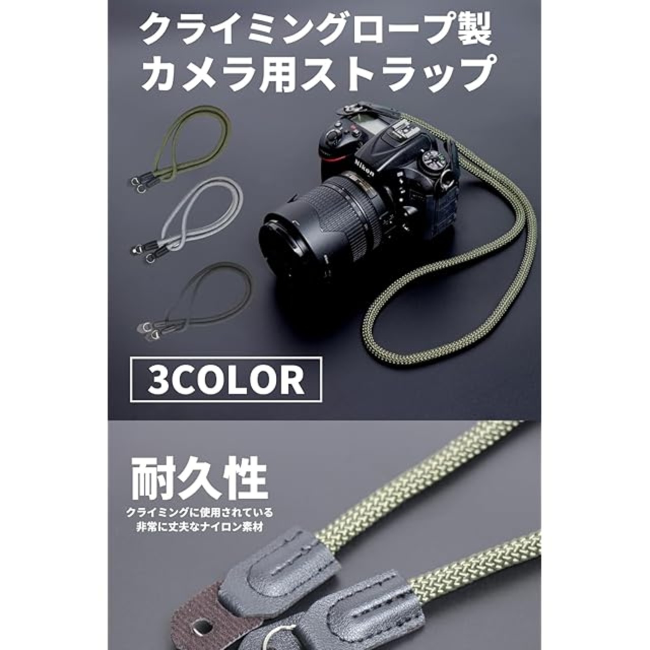 クライミングロープ製のカメラ用ストラップです。クライミングロープとは、クライミングに使用されている非常に丈夫なナイロン素材です。耐久性にとても優れています◎ シンプルなデザインで太めのストラップなので、アウトドアシーンなどでお洒落に決まります。