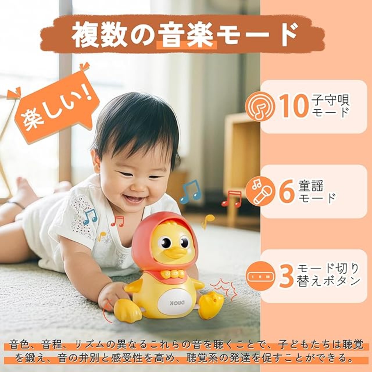 ダブルミュージカルモード:母アヒルは2つの音楽モードを切り替えることができ、それぞれのモードには童謡6曲と子守唄10曲あります。赤ちゃんは活発に踊るアヒルに惹かれて、よたよた歩きを追って這うことを学ぶことができます。また、赤ちゃんは子守唄を聞くことで簡単に眠りにつきます。