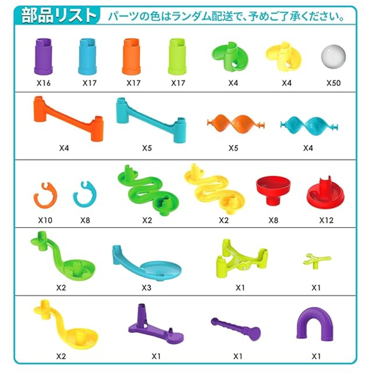 超豪華、大量のスロープトイ: 玉転がしのパーツには、ボールがゆっくりころがっていくスロープ状のものや、ボールが通ると羽根車が回るもの、ボールが通るたびはコースを切り替えるポイントが付いているもの、皿状になっていてボールがくるくる回って落ちていくものなど、さまざまな形がセットされています。6歳以上の子供に適用しています。