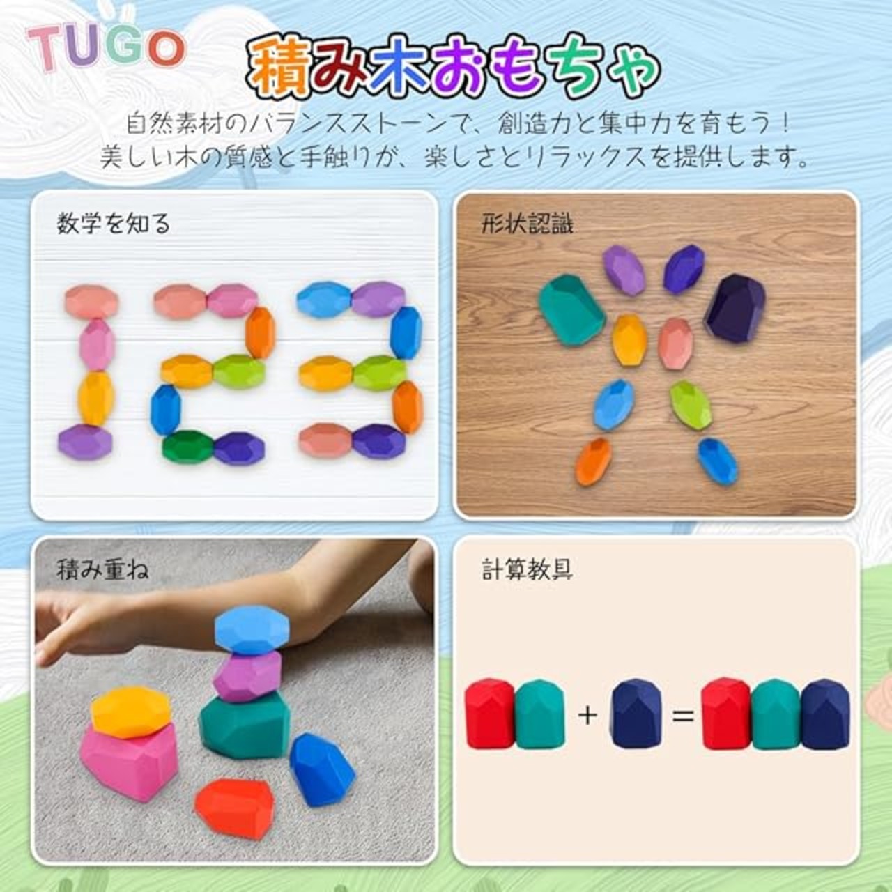 TUGO 積み木 木のおもちゃ 知育玩具 - バランスゲーム モンテッソーリおもちゃ つみき 木製石 石積み ストーン キューブ カラフル キャンデー系 大きさ違う 指先訓練 子供 幼児 玩具 0歳 1歳 2歳 3歳 誕生日プレゼント