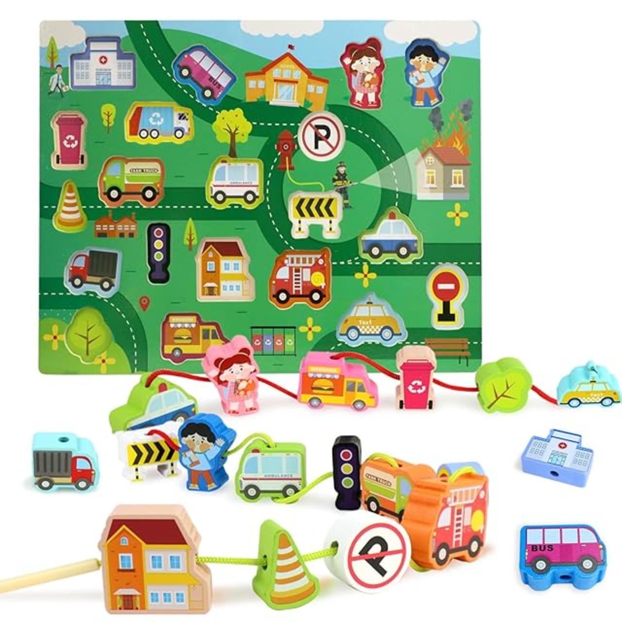 CORPER TOYS 木製紐通しおもちゃ ひもとおし 乗り物 セット 紐通し おもちゃ 交通標識シリーズ 型はめパズル 指先練習 ピース遊び 20PCS 男の子 女の子 クリスマス プレゼント