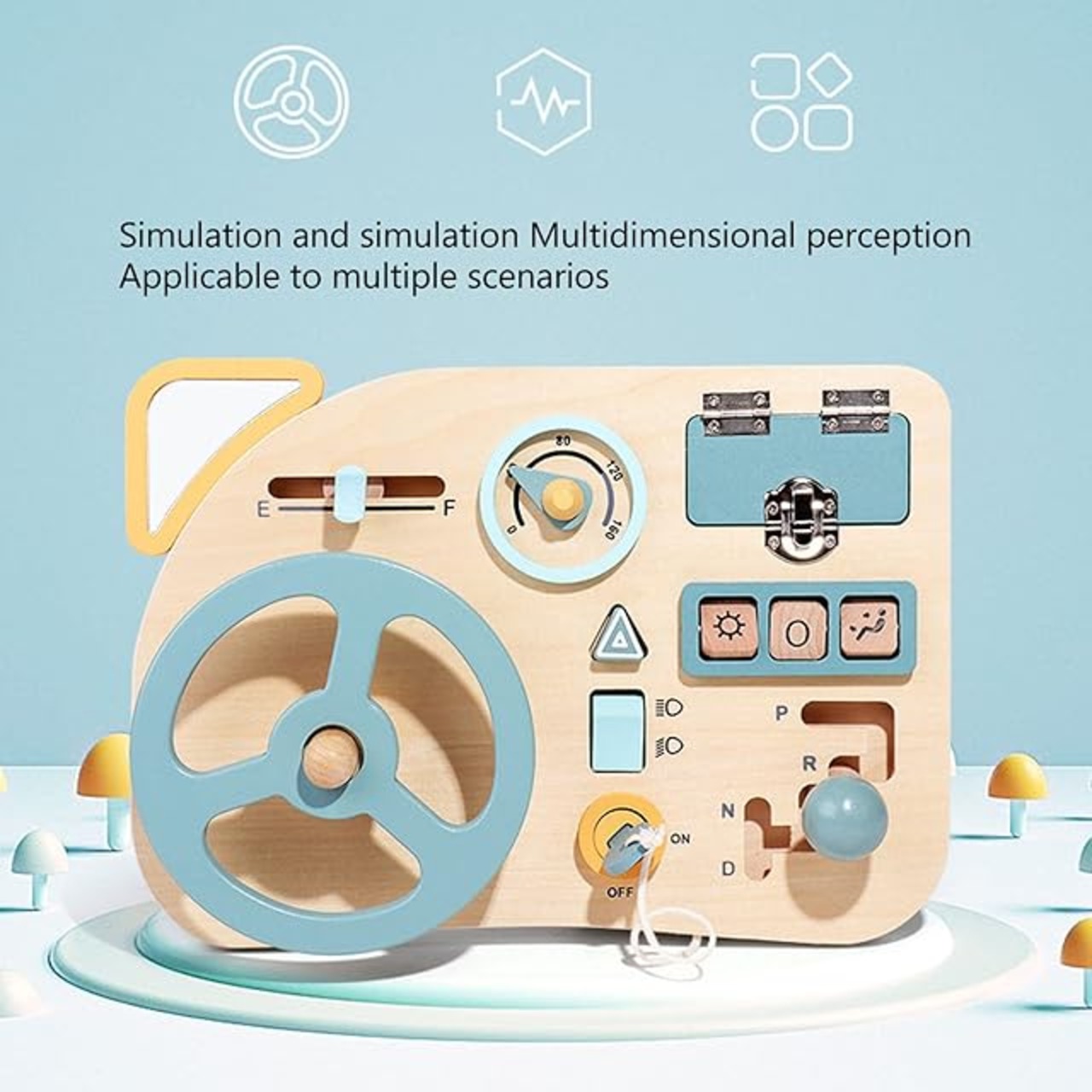 幼児のためのハンドルビジーボード --- パズル木製ダッシュボードには、キースタート、ギアシフト、ハンドルターン、ホーン、調整可能なヘッドライトとミラー、安全警告信号など、車のダッシュボードに不可欠な要素がすべて備わっています。