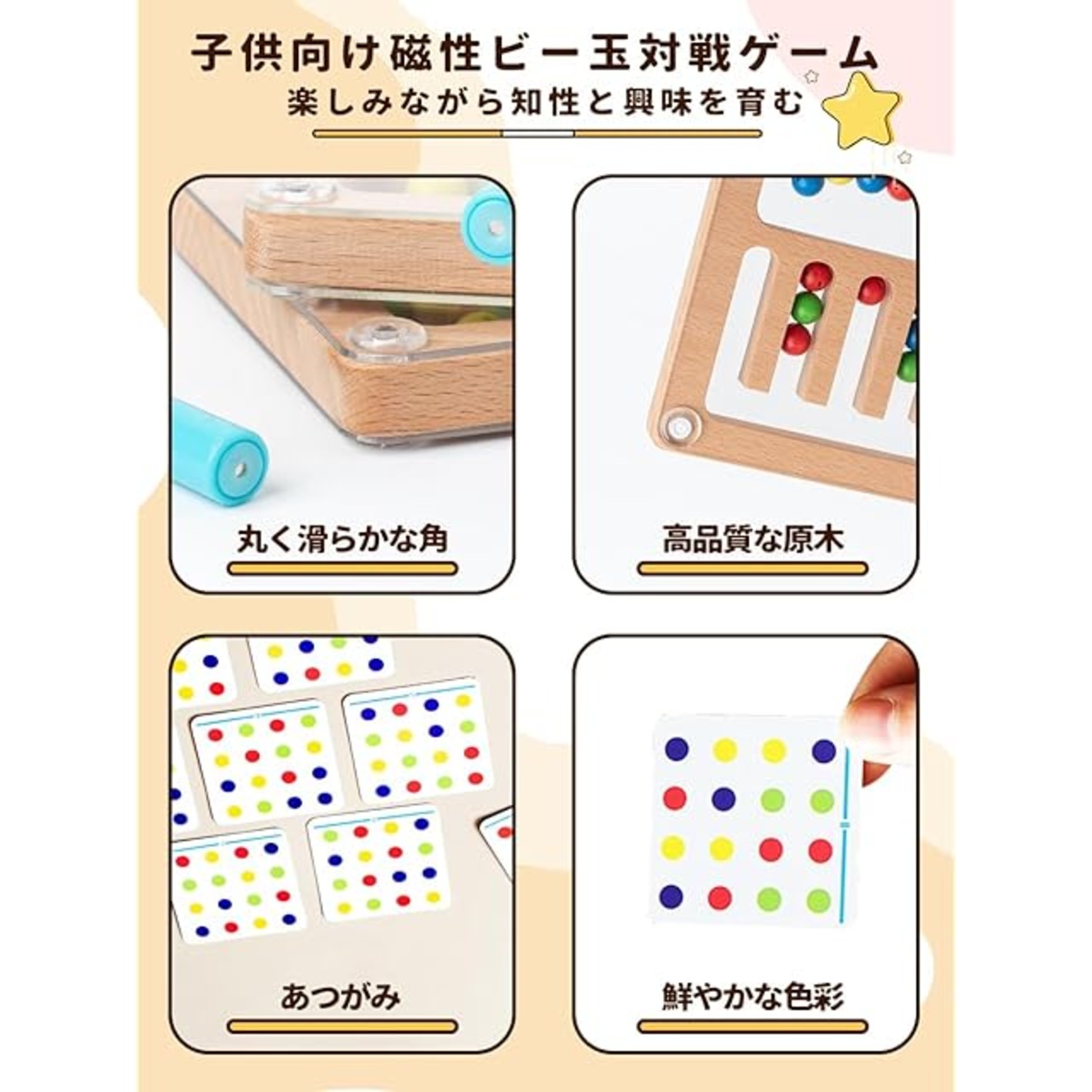 【新型マグネット迷路ボード】カードをランダムに引き、カードに書かれた色の並び順に、磁力の棒を使って先にその色の組み合わせを並べることができるか競います!パッケージには磁気迷路パネル2枚、磁力の棒2本、鈴1つ、30枚のゲームカードが含まれています。家族や友人と一緒に遊びながら、協力やコミュニケーション能力を育むことができます