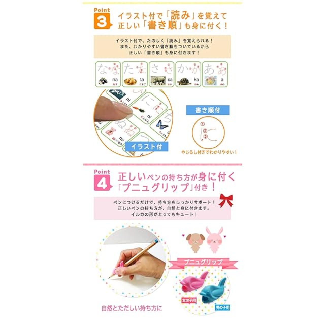 プニュグリップを使用すればペンの正しい持ち方が身につきます。 わかりやすい書き順つきで、正しくきれいな文字・数字のお勉強用シートです。 何度でもくり返し練習ができ、楽しいので自ら進んで学習できます。