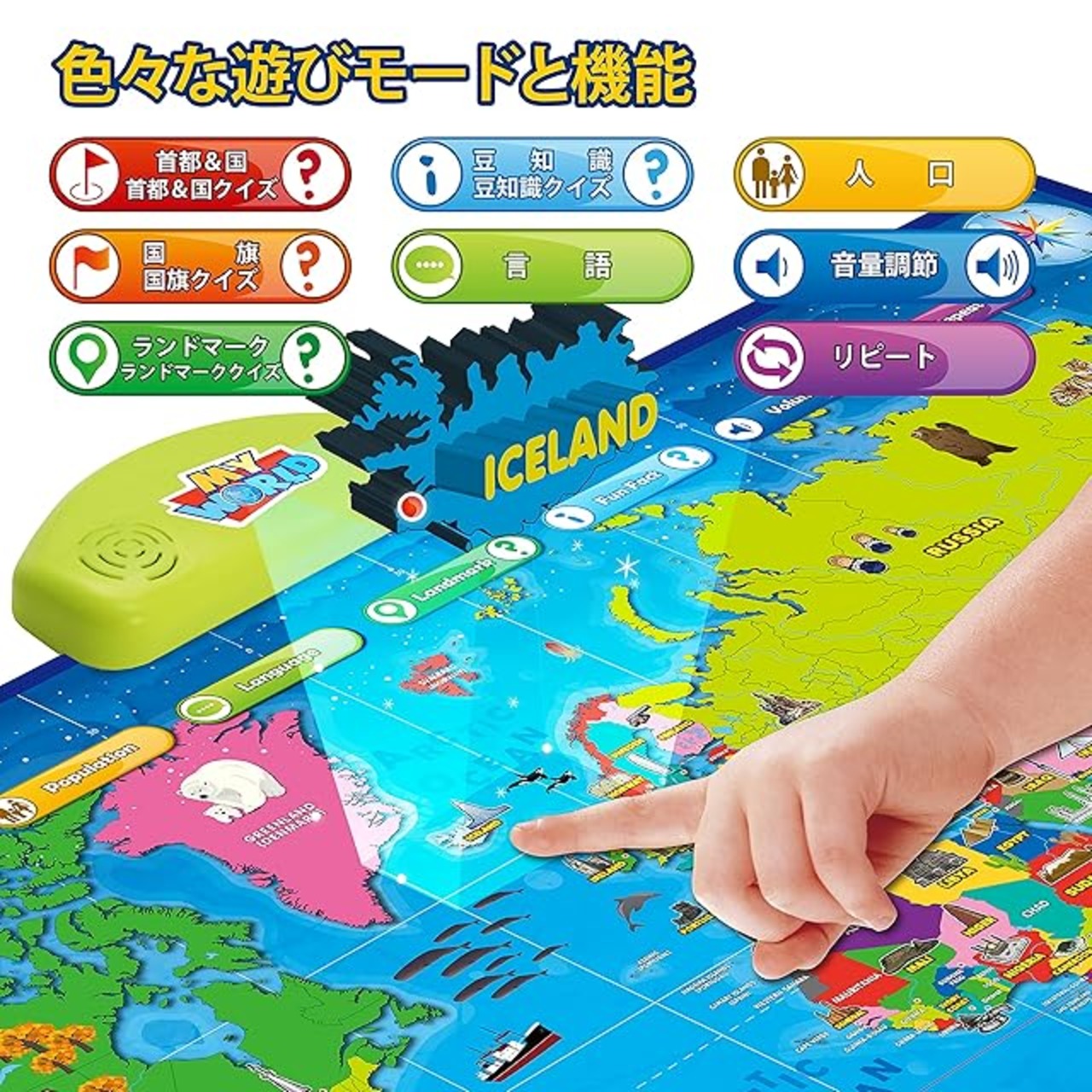 "複数の賞を受賞した楽しい知育玩具 - 2018年「ファミリーチョイス賞(Family Choice Awards)」、「ママズチョイス賞(Mom's Choice Awards)金賞」、「ティリウィグ・ブレインチャイルド賞(Tillywig Brain Child Award)」、2019年「クリエイティブチャイルド・プロダクトオブザイヤー(Creative Child Product of the Year Award)」受賞。 大人気の対話型スマート教育おしゃべり世界地図ポスター。"