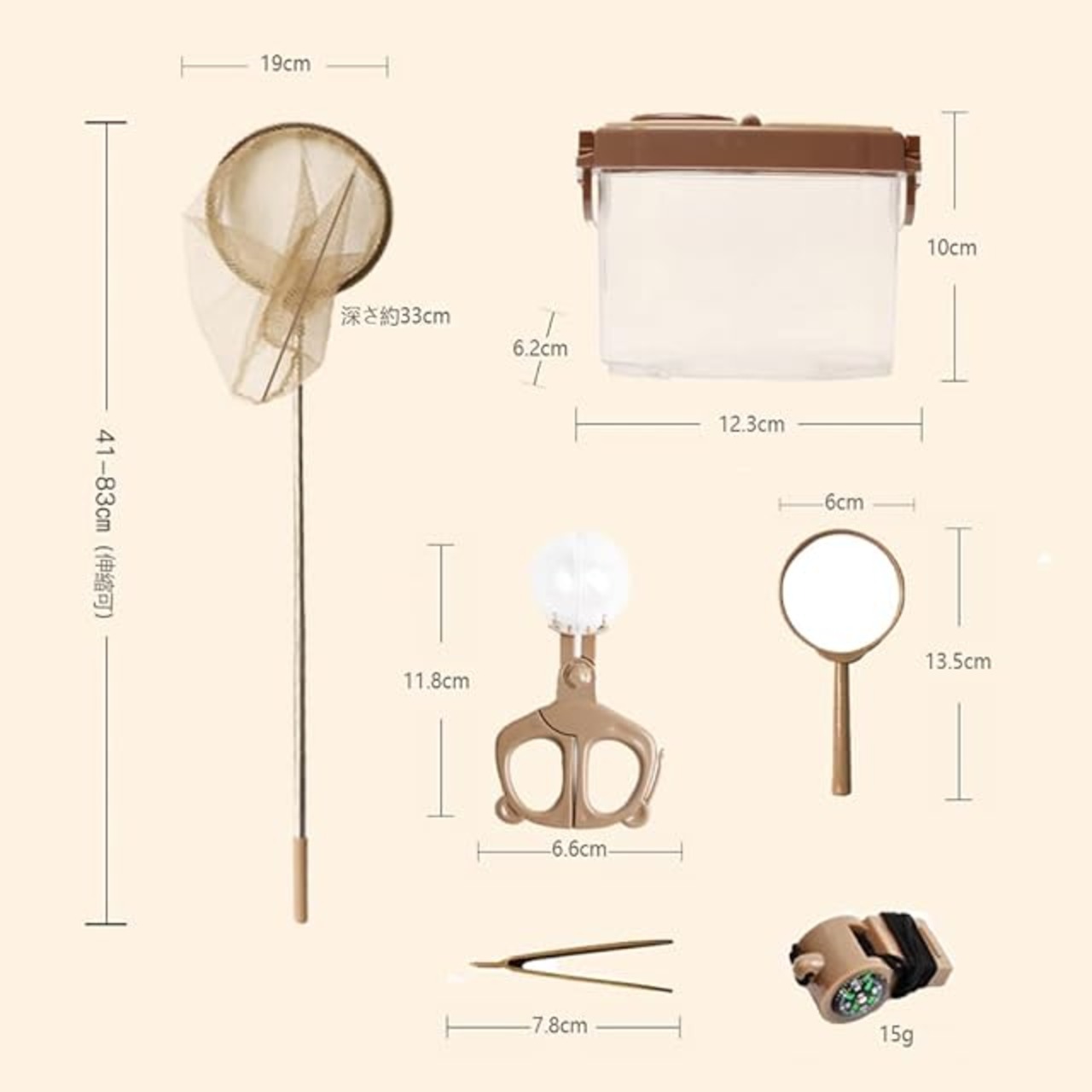 【商品情報】6点セット内容:虫取り網(携帯型伸縮式 取り外し可能)、昆虫観察ボックス、ピンセット、コンパス笛、バグキャッチャー 素材:ABSプラスチック+PMMA光学レンズ+ステンレス鋼+ポリエステル