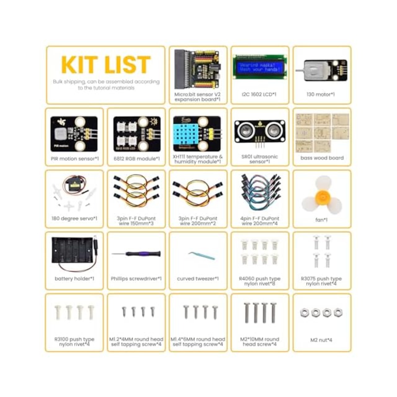 注意: micro:bit V2 と 6 本の AA 電池はキットに含まれていないため、別途用意する必要があります。