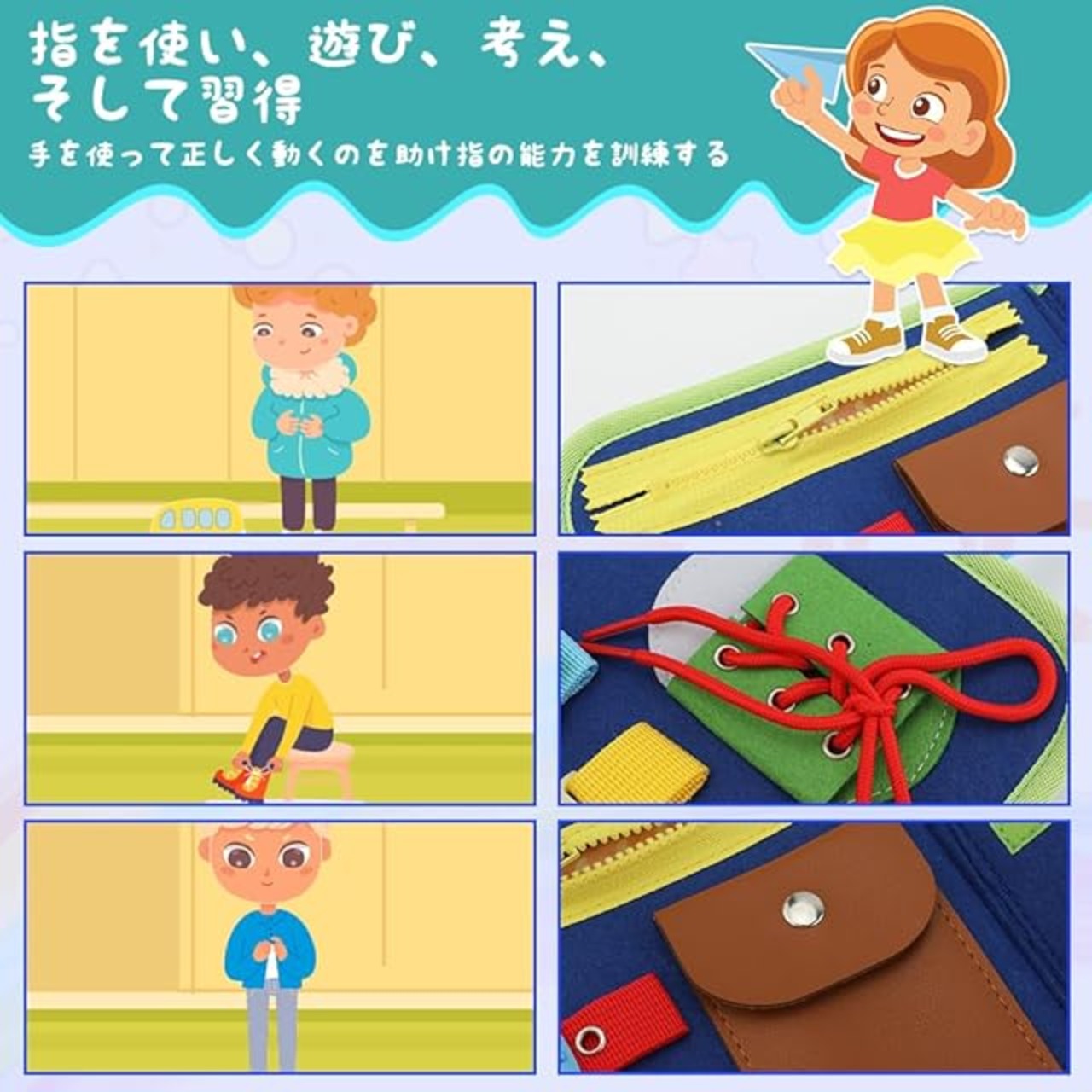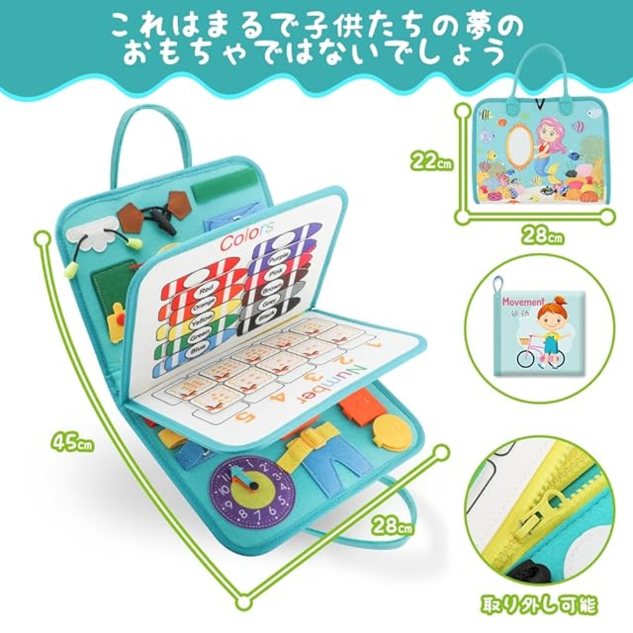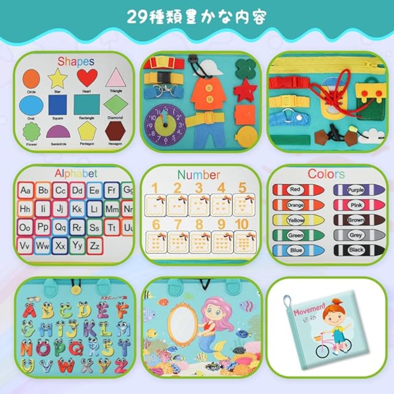 子供のための:ボタン、ファスナーなど、子供が遊びたい衣類の留め具がつのボードに集まっています。ほかには、魚の種類を学び、時間の勉強、英語学習、カラー、数字及び形認識など様々な遊び方、親子遊びに最適な幼児モンテッソーリおもちゃです