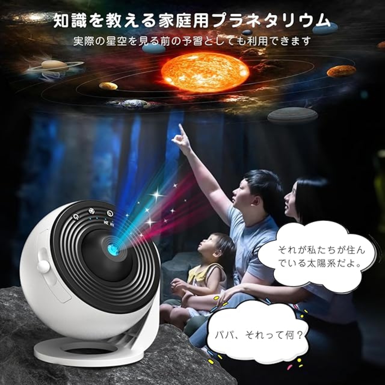 【Type-Cポート・360度角度調整可能な投影】 こちらのおうちプラネタリウムは、Type-Cポートを搭載し、複数の電源供給方法に対応。長時間安定した照明が可能で、屋内外問わずどこでも使用できます。アウトドアにも最適で、キャンプや夜のピクニックで星空を楽しむことができます。投影範囲は1.64~9.84sq/ft、最長3メートルの投影が可能で、幻想的な星空や太陽系の美しい映像を楽しめます。さらに、360度角度調整機能を搭載しており、壁、床、天井に簡単に投影できます。