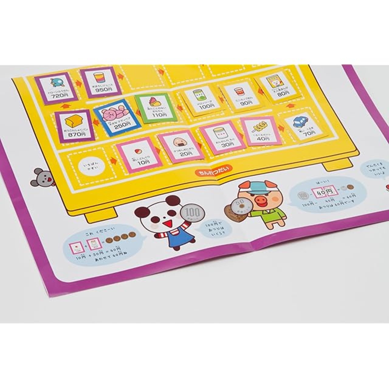 おかいもの体験ができる2つのすごろくと、お金の知識が身につく8このミニゲームが付属。カードやコマも一式ついているので、パッケージを開けてパーツ類を切り取れば、すぐに遊べます。