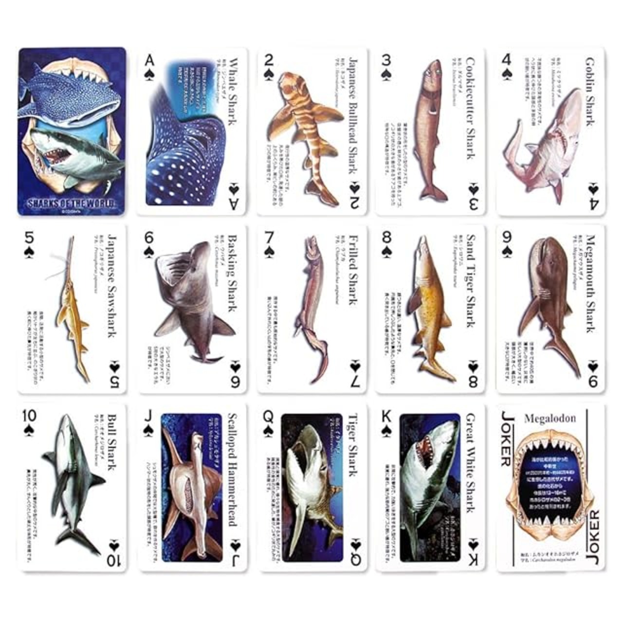 【生態や食性が多種多様なサメ】 サメの祖先が地球上に出現してから約4億年も生きながらえてきたサメは、 種によって異なる繁殖方法や様々な食物を捕食する能力をそなえています。 このトランプに登場する種は“危険なサメ”No.1のホホジロザメ、 魚類最大でプランクトンを食べるおとなしいジンベエザメなど特徴あるサメ14種を選んでいます。 『サメの仲間』たちをより理解していくことで、生物への興味と知識をいっそう深めていただきたいと考え企画制作しました。