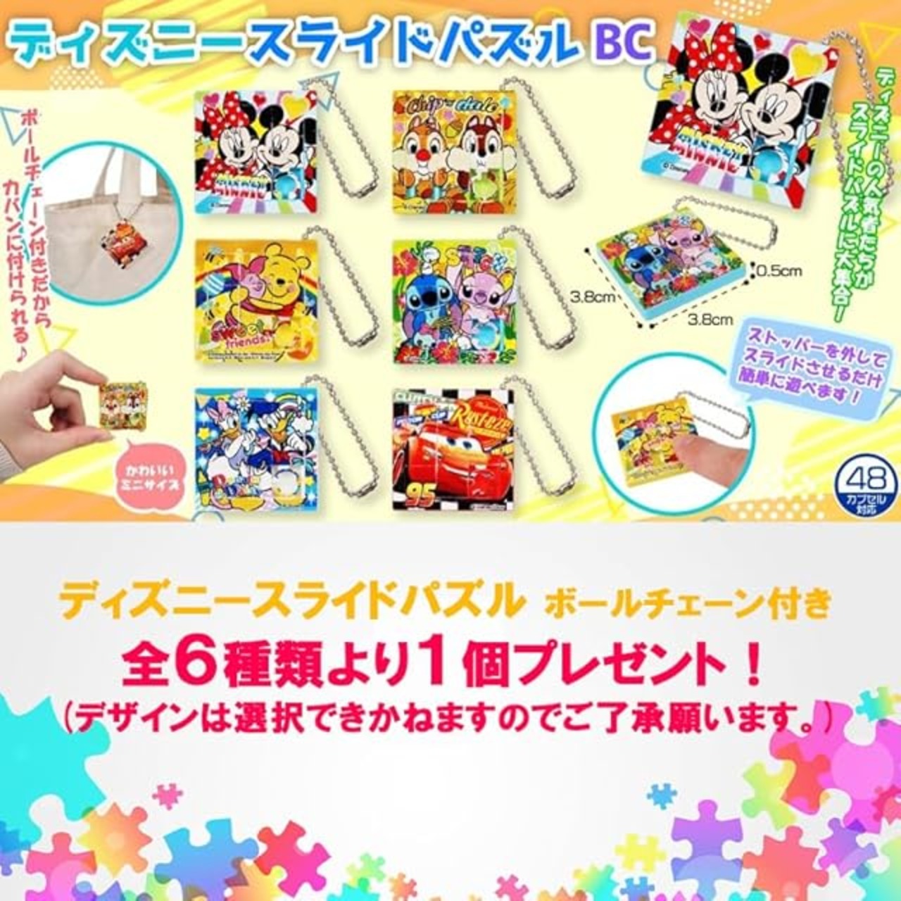 【プレゼント】 デ ィ ズ ニ ー キャラクター ミニスライドパズル を1個プレゼント。持ち運びに便利な3.8cm角のミニサイズのスライドパズル!8ピースをスライドさせて完成させよう!こちらも頭をフル回転させてくださいね!