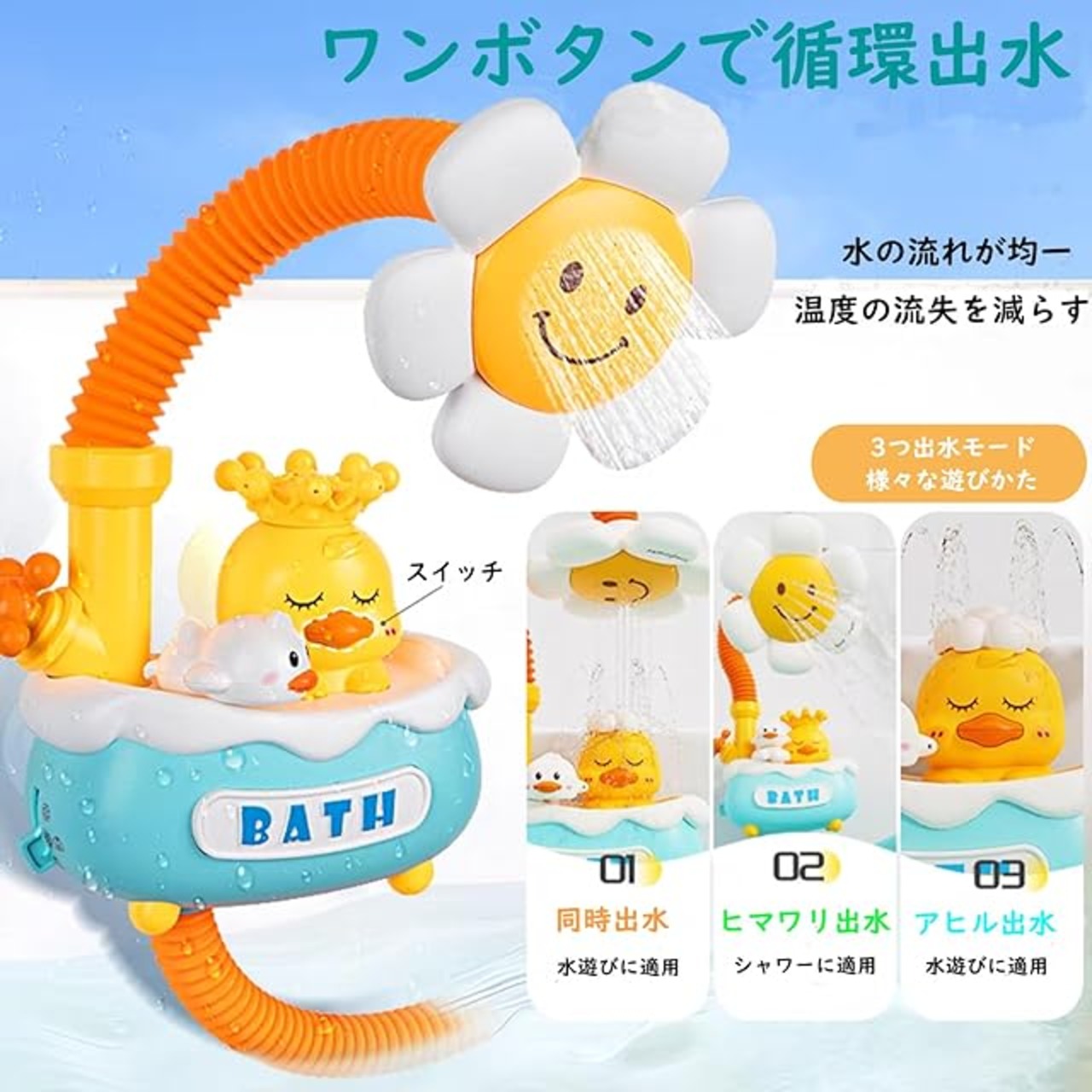 可愛いお風呂おもちゃ:本体は可愛いヒマワリがシャワー、アヒルが噴水できる設計され、「アヒルの口」がスイッチですが、長押して、電源ON/OFFになり、お子様も簡単に操作できます。付属品のまばたきするアヒルが本体の裏側のネジ式を回すだけで水の上をスイスイ泳ぎます。電池がいらず繰り返し使用可能です