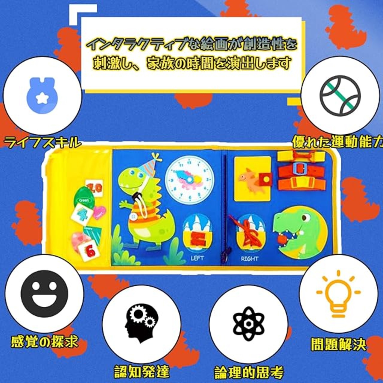 【18IN1モンテッソーリで成長をサポート】 この18IN1のモンテッソーリ おもちゃは子どもたちが大好きな恐竜をテーマにして 、ボタン、ジッパー、靴紐、数字、アルファベット、恐竜パズルなど18種類の遊びを搭載。指先の器用さ、手眼協調、論理的思考、STEM認知スキルを育成します。外出先での学習の楽しさを解き放ち、幼児に充実した発達の旅のためのツールを与えます。