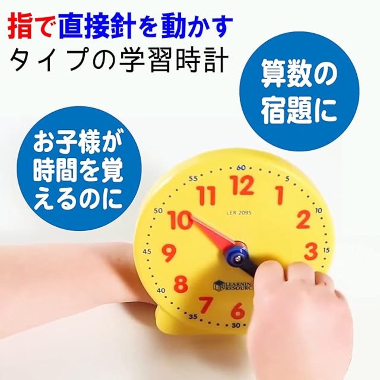 学校の授業などで使われることを想定した算数教材の学習時計は、大きな文字盤で見やすく、長針を動かすと短針も連動して動く歯車内蔵。