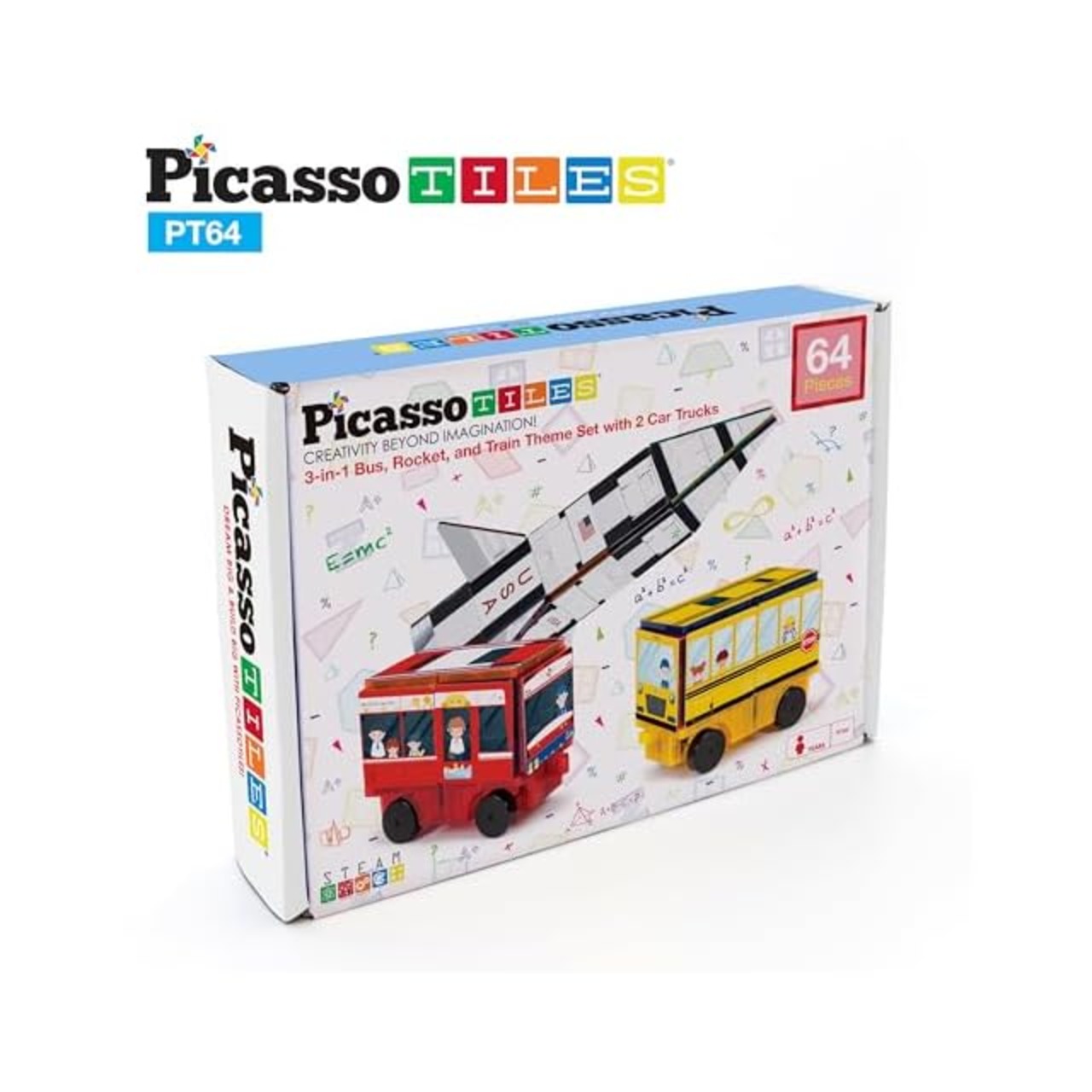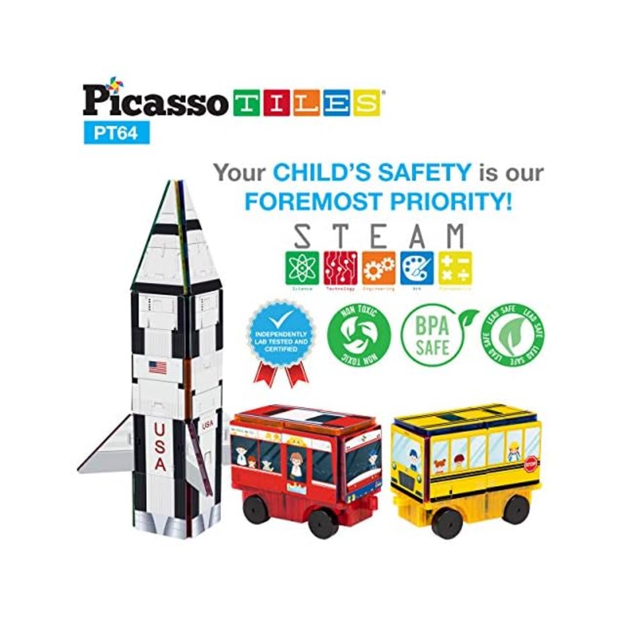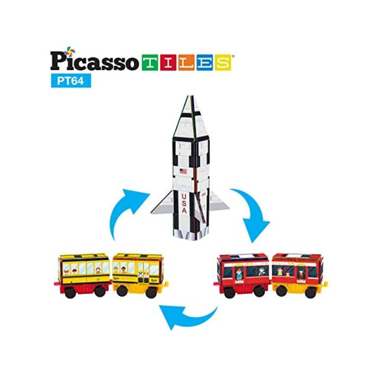 PicassoTiles マグネット組み立てブロック 乗り物セット ロケット スクールバス 電車 初期教育 STEM教育 3in1 くっつく パズル ごっこ遊び マグネットタイル キッズ 積み木 おもちゃ マルチカラー
