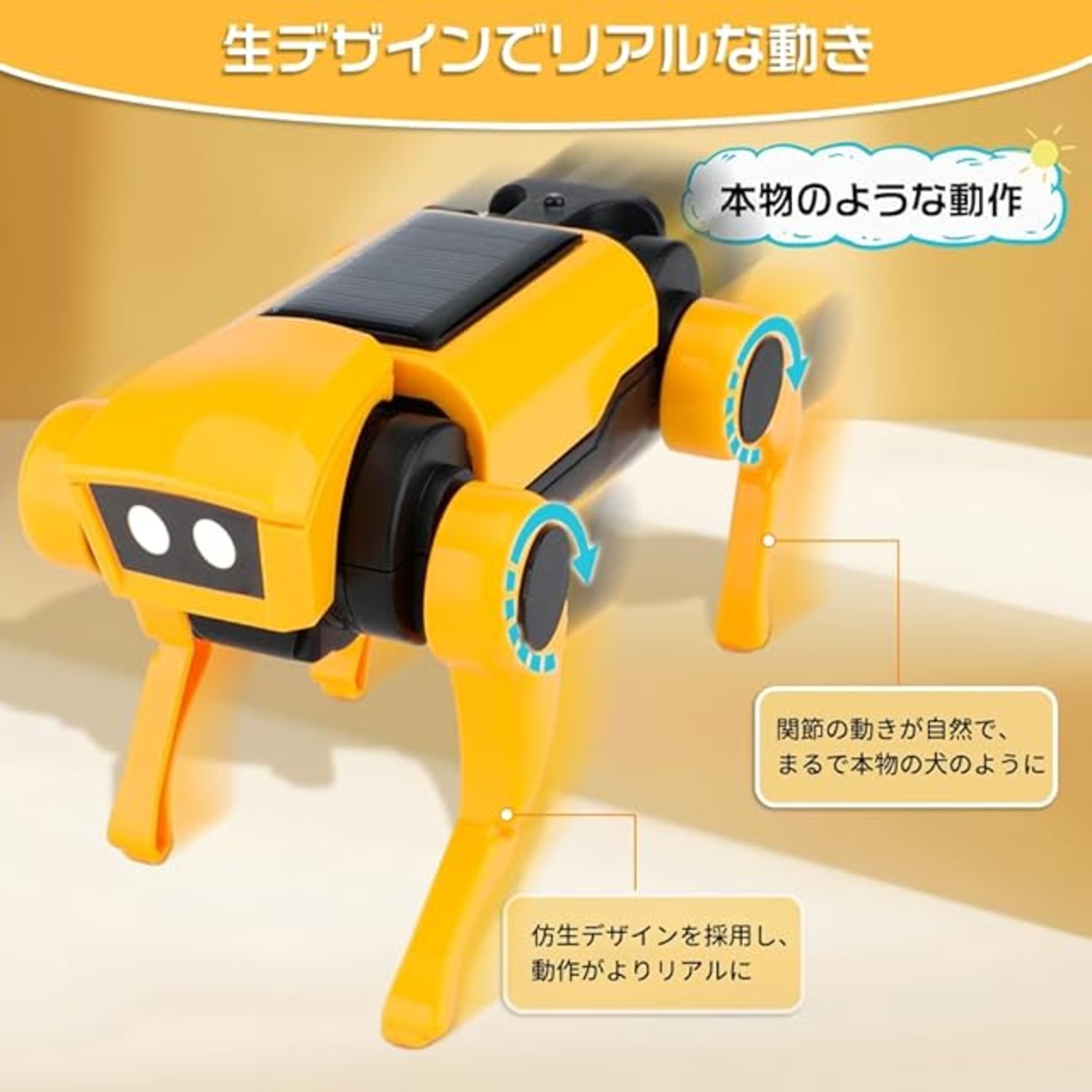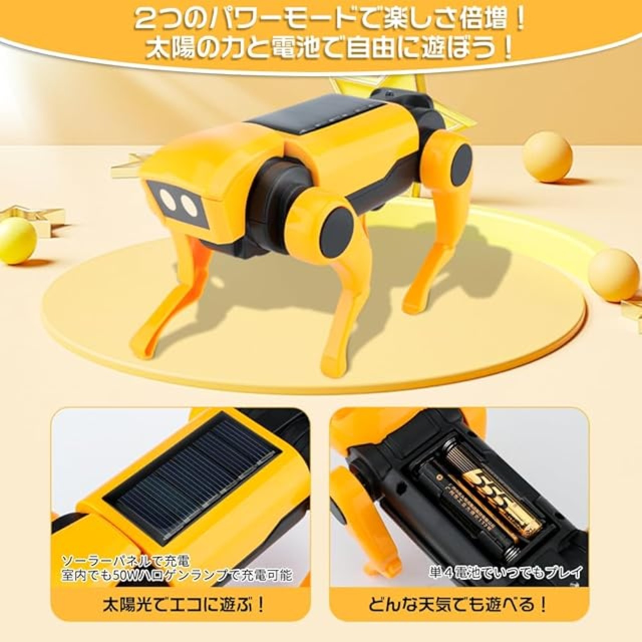 【エコな遊び方: ソーラー&バッテリー対応】ロボット犬は、ソーラーパネルとバッテリーの2つの動力源から選べます。晴天の日は、ソーラーパネルを取り付けて太陽エネルギーで遊び、室内や曇りの日にはバッテリーで楽しむことができます。50Wのハロゲンランプを使用すれば、室内でも簡単に充電が可能です。子供たちはこのエコな遊び方を通じて、環境意識を育むことができます。