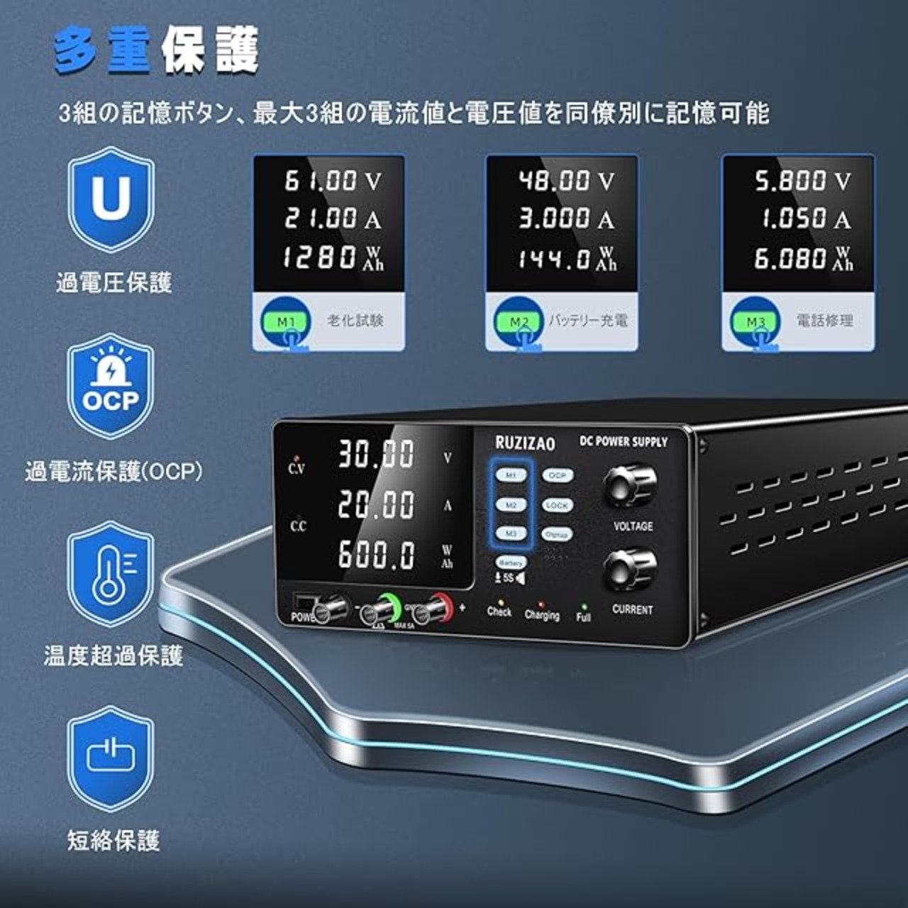 【3つの記憶記憶ボタン、調節時間を節約する】:大電力 可変直流安定化電源には3つの記憶ボタンが追加されており、初めて使用するときにM 1/M 2/M 3のボタンを押すだけで、自分のニーズに応じて所望の電流と電圧を追加し、もう一度同じ記憶ボタンをクリックすると、所望のデータを保存することができ、最高3組のデータ保存をサポートすることができ、次に使用する必要があるときに必要なデータの格納ボタンを直接押すことで、再調整する必要がなく使用することができる、非常に便利です!
