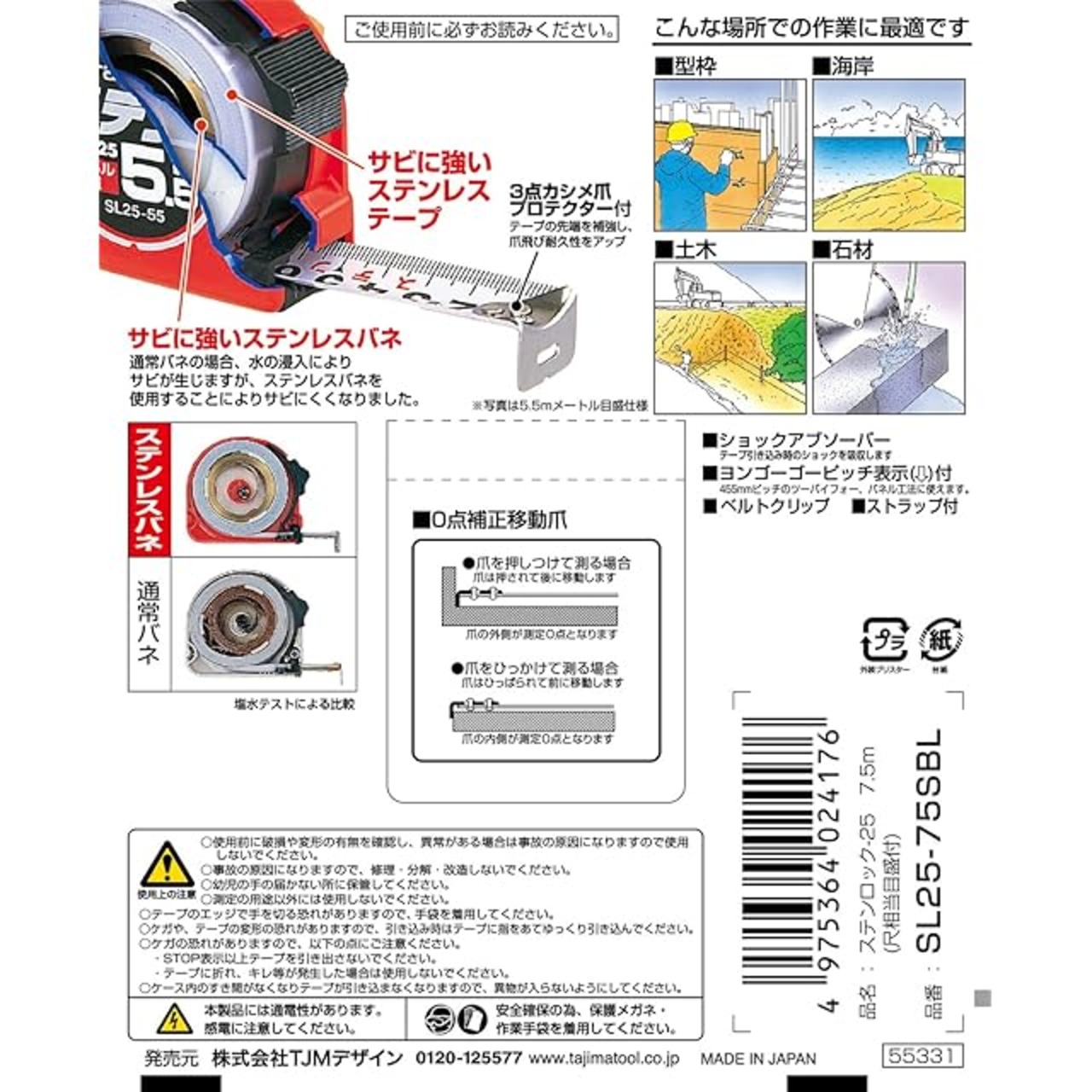 タジマ(Tajima) コンベックス ステンレステープ7.5m×25mm ステンロック25 尺相当目盛付 SL25-75SBL