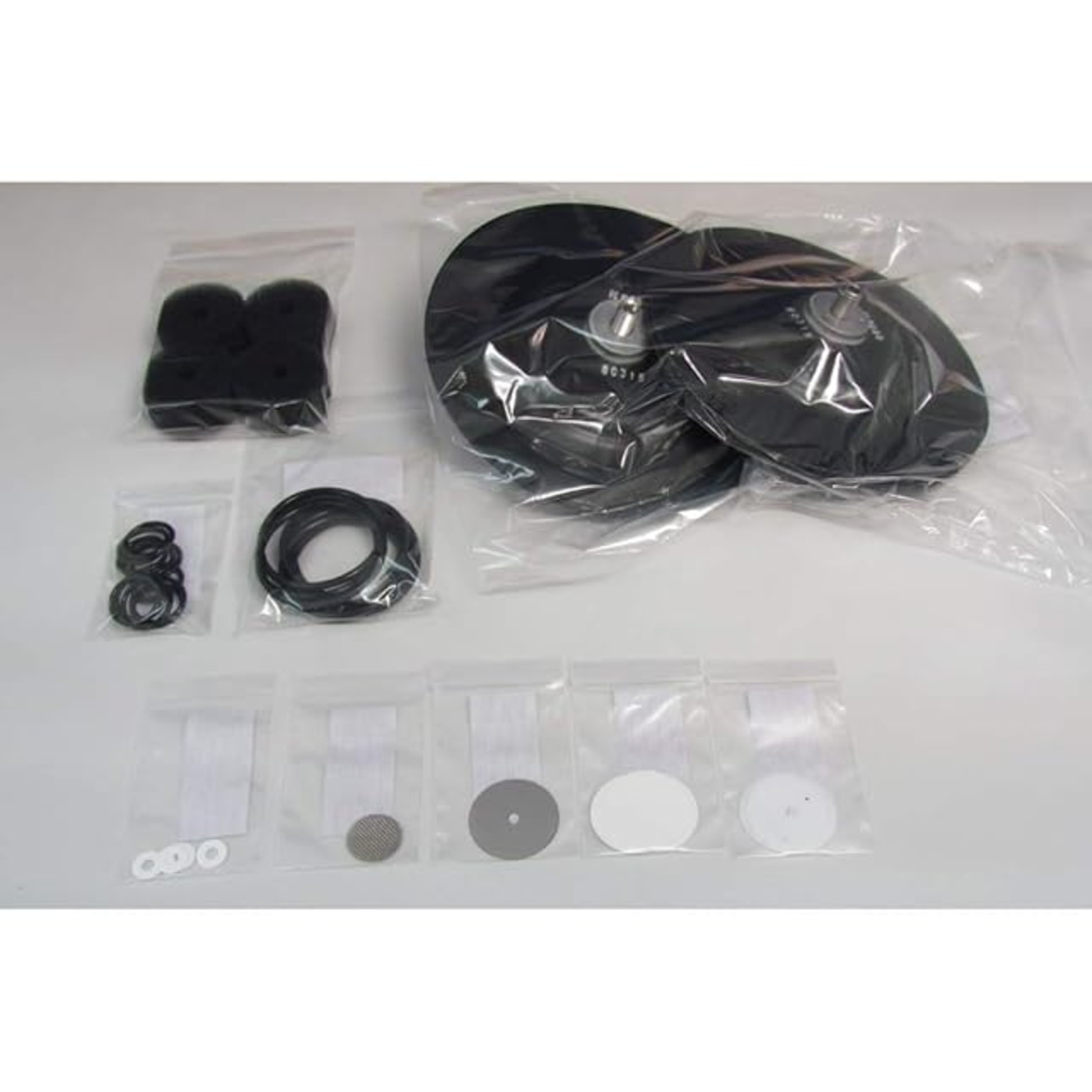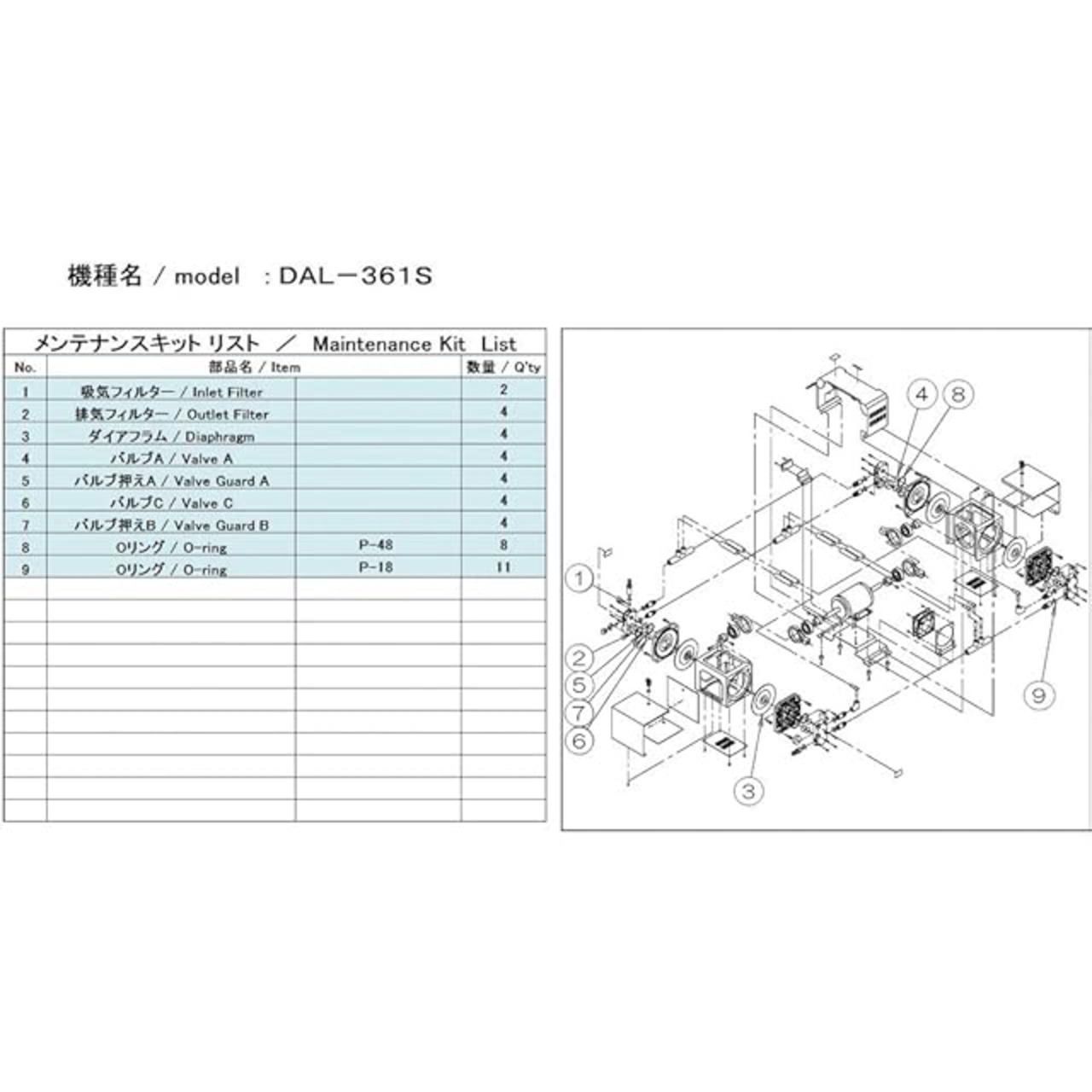 ダイアフラム×4、吸気フィルタ×2、排気フィルタ×4、バルブA×4、バルブ押えA×4、バルブC×4、バルブ押えB×4、Oリング(P-48)×8、Oリング(P-18)×11