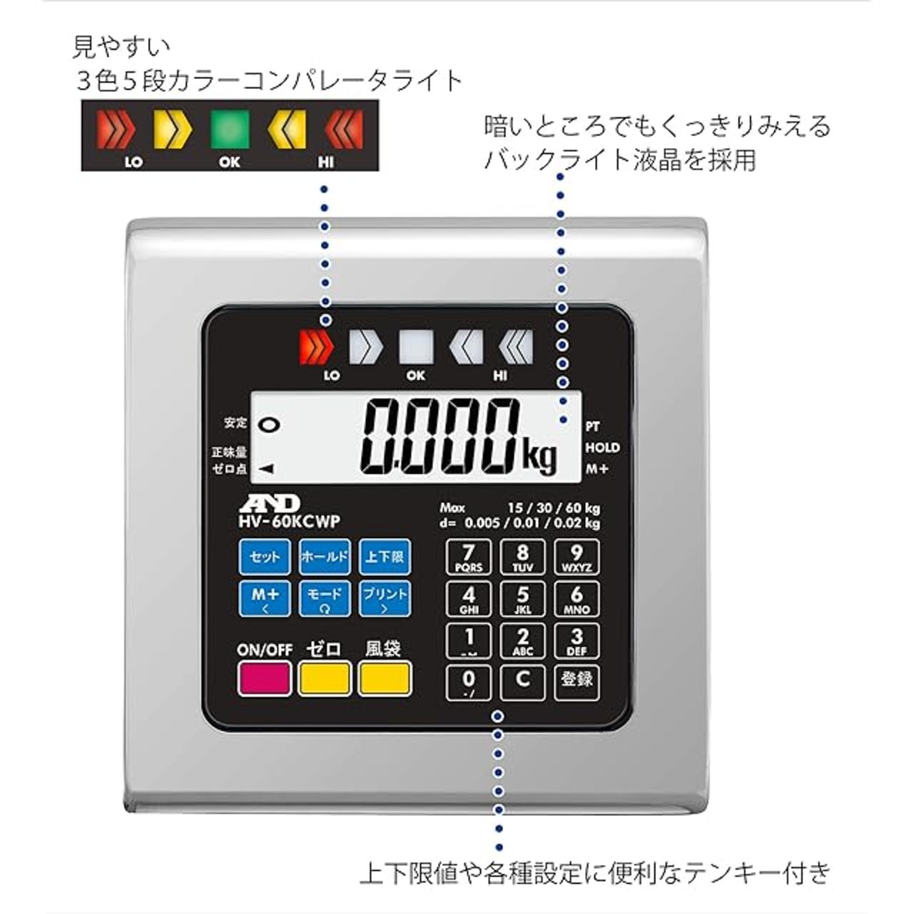 A&D 防塵・防水デジタル台はかり HV-60KCWP ≪ひょう量:60kg 最小表示:0.02g 皿寸法330×425mm 検定無≫※計量法準拠製品